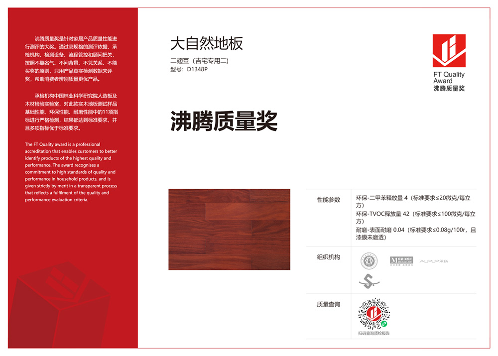 大自然地板(二翅豆吉宅專用二,型號:D1348p)獲得沸騰質(zhì)量獎并非偶然,作為大自然地板精工品質(zhì)的代表,大自然二翅豆實木地板,不僅有高顏值,而且有著“高內(nèi)涵”。甄選野生原木,材材質(zhì)硬、密度大,具有良好的抗壓、耐磨實力,自然舒適、無漆工藝,天然環(huán)保,一經(jīng)推出,就受到了消費者的青睞,是諸多追求品質(zhì)生活的家庭的首選。優(yōu)異品質(zhì)背后,折射的是大自然多年來在深耕綠色環(huán)保產(chǎn)品領(lǐng)域的堅持。從地板到大家居,大自然地板不斷推動產(chǎn)品升級,以高于國家標準的制作水平,不斷進行技術(shù)升級,助力健康家居生活打造。