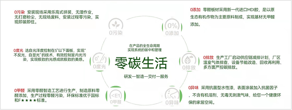 大自然家居2022年新品倡導零碳生活方式,力爭在產(chǎn)品的全生命周期實現(xiàn)系統(tǒng)的“碳中和”管理,順應“零碳消費”潮流而潛心研發(fā)新產(chǎn)品。0污染、0添加、0度光、0排放、0甲醛、0異味,這6個0將成為大自然家居2022年新品的標簽。