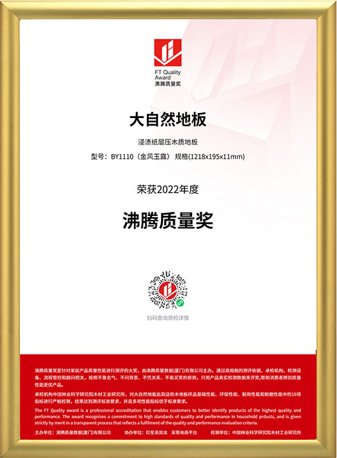 “設(shè)計看紅點獎,質(zhì)量看沸騰獎”!2022年7月9日,掌握2大核心科技的大自然家居蟬聯(lián)“沸騰質(zhì)量獎”,其獲獎產(chǎn)品金風玉露(型號:BY1110)融合了“零醛智造”和“防水科技”,16項性能指標遠遠優(yōu)于國家標準。這是繼去年大自然家居實木地板二翅豆(型號:D1348P)獲獎后,該公司再次獲得該大獎。